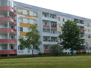 Das fünfgeschossige Gebäude ist von großzügigen begrünten Freiflächen umgeben. Ein Kinderspielplatz,Sitzgelegenheiten und ein Trockenplatz sind vorhanden. Die Straßenbahnhaltestelle, evangelische Grundschule, Einkaufsmärkte und Ärzte sind in 5 Gehminuten zu erreichen.